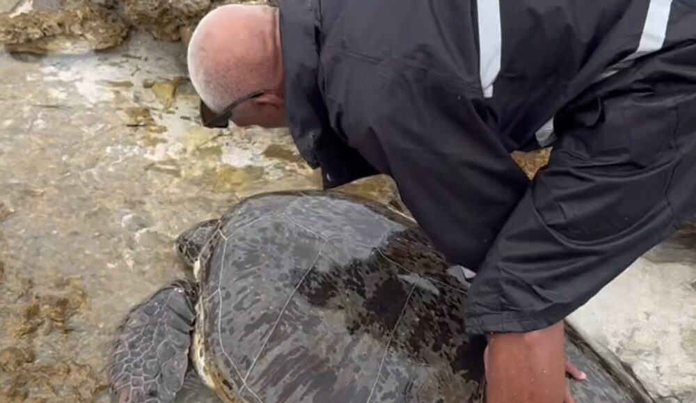 C’est en se baladant sur le récif que Claire, une habitante de Arutua a découvert une énorme tortue coincée. « Elle lui a mis un peu d’eau. Elle bougeait donc elle a posé un feuillage pour reconnaître l’endroit où elle était et elle est rentrée pour venir nous appeler », raconte sa nièce Temahuki Tepurotu.
