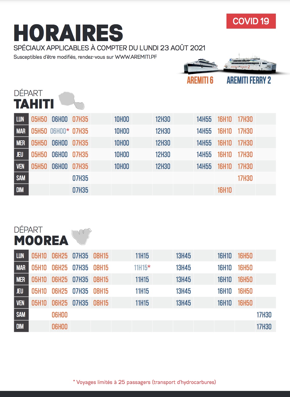 Infos Pratiques Aremiti : horaires à partir du 23 août Publié le 23/08/2021 à 13:46 Mise à jour le 26/08/2021 à 8:23 Rédaction web Partager FacebookTwitterLinkedinEmail Dernières news Paea : un père violent jugé après une nuit de terreur sous les yeux de son fils Il y a 5 heures Ocean IA, l’intelligence artificielle au secours des baleines à Moorea Il y a 11 heures 4,87 tonnes de cocaïne… mais pas de poursuites judiciaires Il y a 11 heures A lire aussi Société Transport scolaire à Moorea : l’ultime appel au dialogue des chauffeurs de bus avant la justice 12/01/2026 à 17:56 Faits divers Une femme retrouvée sans vie dans le lagon de Moorea 27/12/2025 à 15:14 Sports À couper le souffle, l’Ultra-trail de Tahiti-Moorea convainc la Ligue Ultra 21/12/2025 à 15:06 dans la même rubrique Nouvel An Chinois : l’école de danse Li Yune prépare un nouveau spectacle Il y a 14 heures Nouvel An chinois : illumination des lanternes le 12 février à Papeete Il y a 15 heures Travaux de nettoyage : circulation partiellement fermée en soirée à Papeete Il y a 4 jours