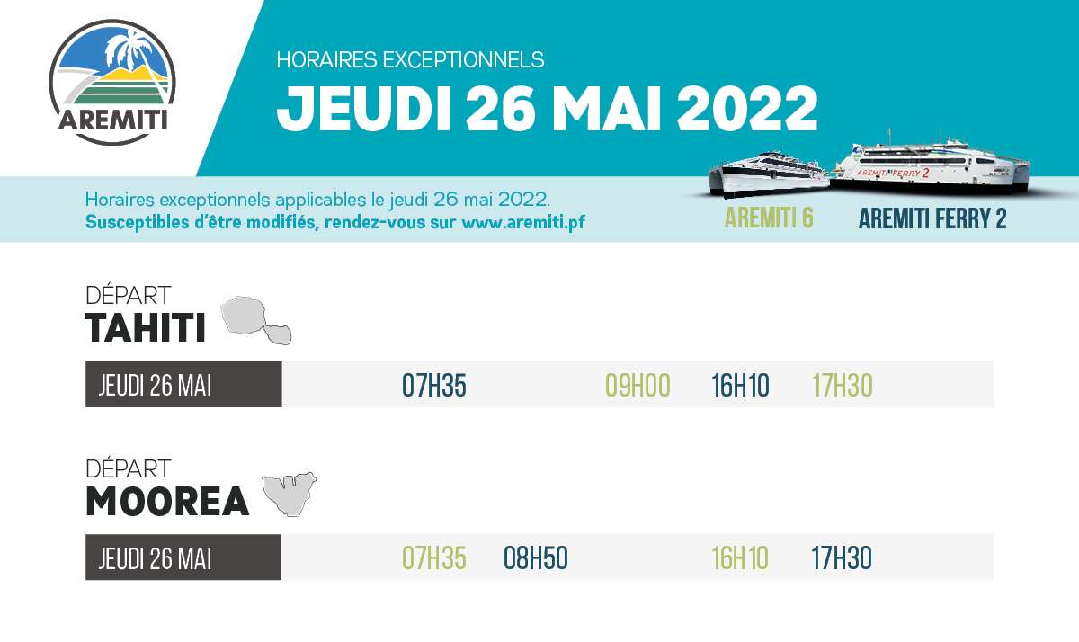 Infos Pratiques Aremiti – Horaires exceptionnels du jeudi 26 mai Publié le 06/05/2022 à 14:31 Mise à jour le 06/05/2022 à 14:31 E. T. Partager FacebookTwitterLinkedinEmail Dernières news L’exposition artisanale de Rurutu de retour à l’Assemblée Il y a 6 heures Moorea : le projet de campus abandonné, des internats prévus au lycée agricole de Opunohu Il y a 7 heures Jeux du Pacifique 2027 : 515 millions de Fcfp pour la réhabilitation du complexe sportif de Mahina Il y a 8 heures A lire aussi Société Fin du Terevau : « Ce bateau restera dans le cœur de la population de Moorea » Il y a 2 jours Société Apetahi Express : test réussi pour la future ligne entre la Presqu’île et Papeete 10/09/2024 à 17:12 Infos Pratiques L’Aremiti 5 de retour entre Tahiti et Moorea 05/06/2024 à 10:02 dans la même rubrique L’exposition artisanale de Rurutu de retour à l’Assemblée Il y a 6 heures Fermeture d’une bretelle de la RDO samedi pour des travaux de sécurisation Il y a 9 heures Papenoo : travaux nocturnes sur la route traversière, circulation alternée pendant six semaines Il y a 11 heures