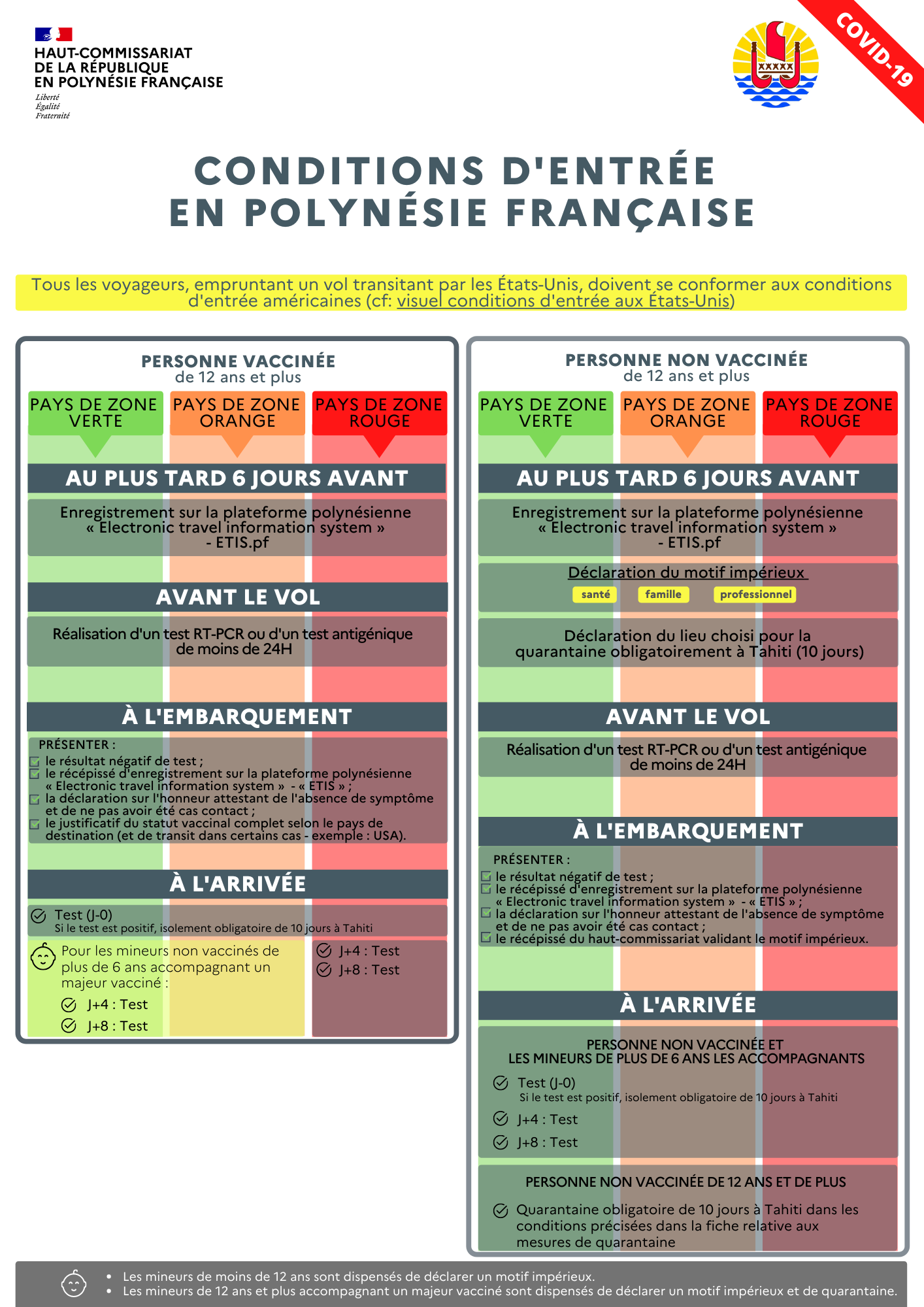 Infos Pratiques Covid-19 – Nouvelles conditions d’entrée en Polynésie à compter du 14 janvier Publié le 14/01/2022 à 11:34 Mise à jour le 19/01/2022 à 11:34 Les conditions d’entrée en France : Les conditions d’entrée aux États-Unis : > La liste des pays classés en zone verte, orange et rouge Rédaction web Partager FacebookTwitterLinkedinEmail Dernières news UPF : une tribune de chercheurs dénonce le huis clos d’un colloque sur la souveraineté Il y a 2 heures Il vole un string et demande un « bisou » en partant : un homme condamné à 12 mois de réclusion Il y a 13 heures C’est fait : Kauli Vaast rejoint le circuit mondial Il y a 14 heures A lire aussi Monde Un vol Air France affrété par Paris pour les Émirats fait demi-tour du fait de tirs « dans la zone » Il y a 5 jours Economie Une ligne directe Papeete – Sydney à compter du 14 décembre Il y a 7 jours Société Fin de la grève des contrôleurs aériens à Tahiti-Faa’a 17/02/2026 à 10:22 dans la même rubrique Les pharmacies et médecins de garde les 7 et 8 mars Il y a 4 jours Fermeture du marché de Papeete jeudi 5 mars Il y a 6 jours Les pharmacies et médecins de garde du 5 mars (férié) Il y a 6 jours