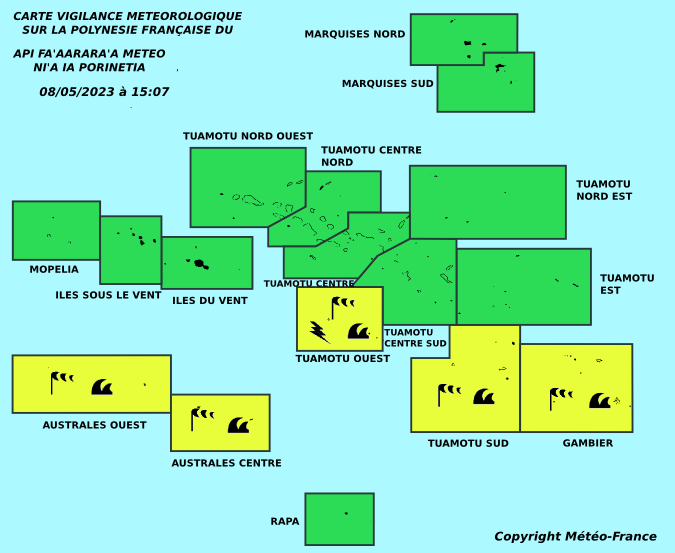 Au Nord, mer forte sur une mer du vent de secteur Est-Sud-Est de 3 mètres 50 à 4 mètres, croisée à une houle longue de Sud autour de 2 mètres. À Rapa, mer localement forte avec une mer du vent de 2 mètres croisée à une houle de Sud de 3 mètres.