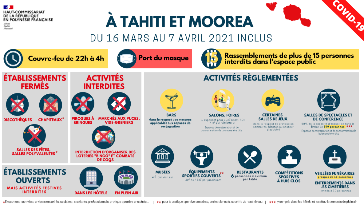 Les salles de spectacles et de conférences pourront désormais accueillir jusqu’à 500 personnes (masquées), dans la limite de 50 % de la capacité d’accueil maximale des salles. Le couvre-feu est maintenu à Tahiti et Moorea tous les jours de 22h à 4h du matin.