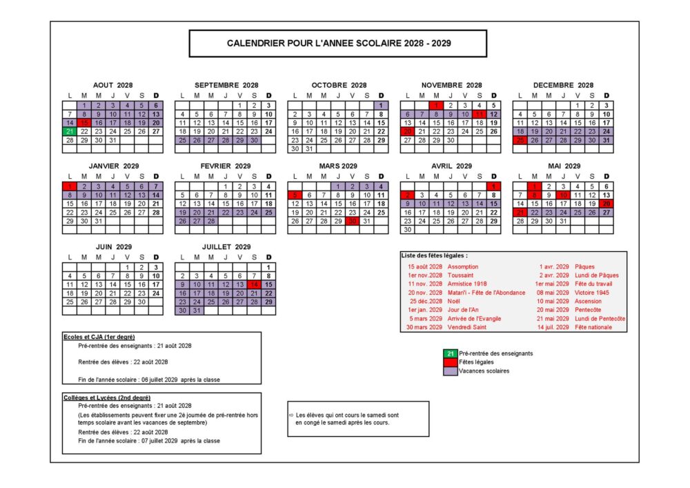 Calendrier scolaire 2028 – 2029