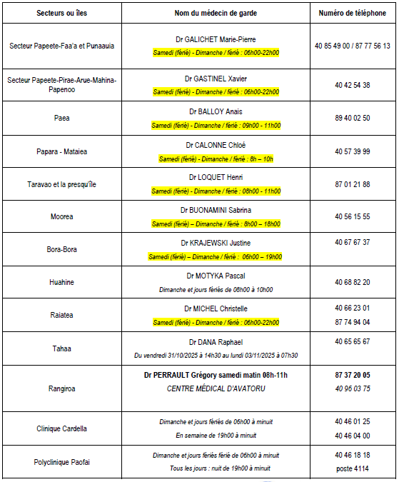 Infos Pratiques Les pharmacies et médecins de garde les 1er et 2 novembre Publié le 31/10/2025 à 15:06 Mise à jour le 31/10/2025 à 16:43 Photo d'illustration (envato elements @ Rawpixel) > Les médecins de garde les 1er et 2 novembre > Retrouvez les pharmacies de garde dans cet article Rédaction web Partager FacebookTwitterLinkedinEmail Dernières news L’inventeur du Poti marara, Léonard Deane, est décédé Il y a 5 heures Les derniers adieux à Emmanuelle Vidal Il y a 5 heures Le Haussariat interdit la vente et l’utilisation de feux d’artifice pour Halloween Il y a 6 heures A lire aussi Infos Pratiques Les pharmacies et médecins de garde les 14 et 15 juin 12/06/2025 à 10:21 Infos Pratiques Pharmacies et médecins de garde les 25, 28 et 29 décembre 24/12/2024 à 14:37 Infos Pratiques Pharmacies et médecins de garde les 5 et 6 octobre 03/10/2024 à 14:33 dans la même rubrique Diabète : dépistage gratuit à Punaauia 23/10/2025 à 10:19 Pour Halloween, c’est la fête de Mautini à Papeete 20/10/2025 à 11:36 Taapuna : chenal et lagon fermés le 14 octobre 10/10/2025 à 16:40
