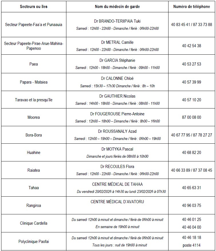 Infos Pratiques Les pharmacies et médecins de garde les 21 et 22 février Publié le 19/02/2026 à 15:30 Mise à jour le 19/02/2026 à 15:30 (Photo d'illustration Pixabay) > Les médecins de garde les 21 et 22 février : > Retrouvez les pharmacies de garde dans cet article Rédaction web Partager FacebookTwitterLinkedinEmail Dernières news Municipales : « Mahina a ti’a », un programme « avec les moyens du bord » Il y a 25 minutes Une aide de 3 000 francs par mois et par enfant pour les familles monoparentales Il y a 29 minutes Un couple blessé à Taravao dans l’incendie de sa maison Il y a 1 heure A lire aussi Infos Pratiques Les pharmacies et médecins de garde les 14 et 15 février 12/02/2026 à 9:54 Infos Pratiques Les pharmacies et médecins de garde les 7 et 8 février 05/02/2026 à 11:41 Infos Pratiques Les pharmacies et médecins de garde les 31 janvier et 1er février 29/01/2026 à 10:10 dans la même rubrique ART HINE : la création féminine à l’honneur à la Galerie Winkler Il y a 5 heures Tureia : l’aérodrome remis aux normes après dix mois de travaux Il y a 2 jours Tahiti : un test exceptionnel des sirènes d’alerte le 18 février Il y a 2 jours