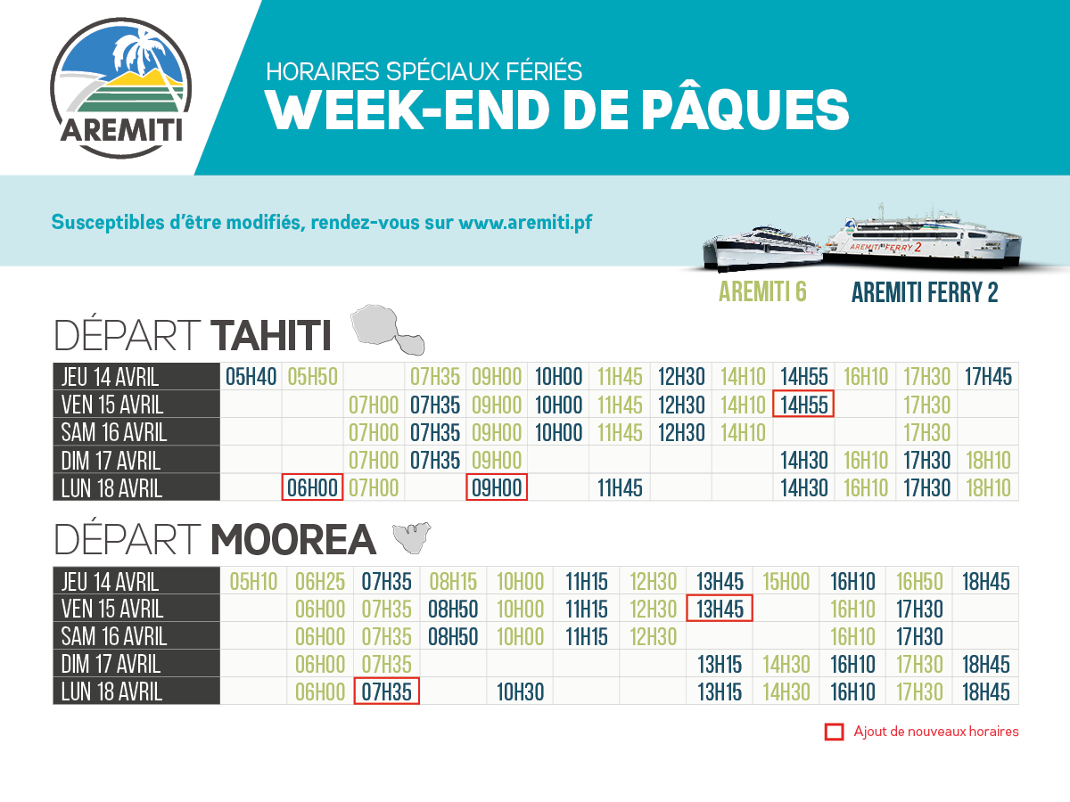 Infos Pratiques Nouvelle navette Aremiti Ferry 2 pour le week-end de Pâques Publié le 18/03/2022 à 10:40 Mise à jour le 31/03/2022 à 15:13 Rédaction web Partager FacebookTwitterLinkedinEmail Dernières news Indexation du SMIG sur l’indice ouvrier : fausse bonne idée, selon Florent Venayre Il y a 45 minutes 00:03:04 Revalorisation du SMIG : l’indice ouvrier au cœur des débats Il y a 1 heure Les réseaux sociaux nuisent gravement à la santé des ados, alerte l’Anses Il y a 2 heures A lire aussi Société Navettes entre Tahiti et Moorea : les usagers prennent leur mal en patience 28/03/2024 à 10:18 Société La société Aremiti se scinde en deux 15/03/2024 à 17:36 Société Vent violent : l’Aremiti 6 en réparation après avoir heurté le quai 11/02/2024 à 16:32 dans la même rubrique Circulation alternée de nuit sur la RT2 à Papeno’o pour des travaux sur deux ponts Il y a 19 heures Ouverture du marché de Punaauia dimanche 25 janvier Il y a 1 jour Orages : vigilance jaune dans plusieurs archipels Il y a 5 jours
