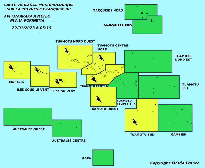 Météo France a étendu ce dimanche la vigilance jaune pour les orages. Mopélia, les îles Sous-le-Vent , îles du Vent, et une grande partie des Tuamotu sont concernés.
