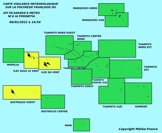 Les îles du Vent, îles Sous-le-Vent et une partie des Australes sont toujours en vigilance jaune pour les orages ce dimanche.