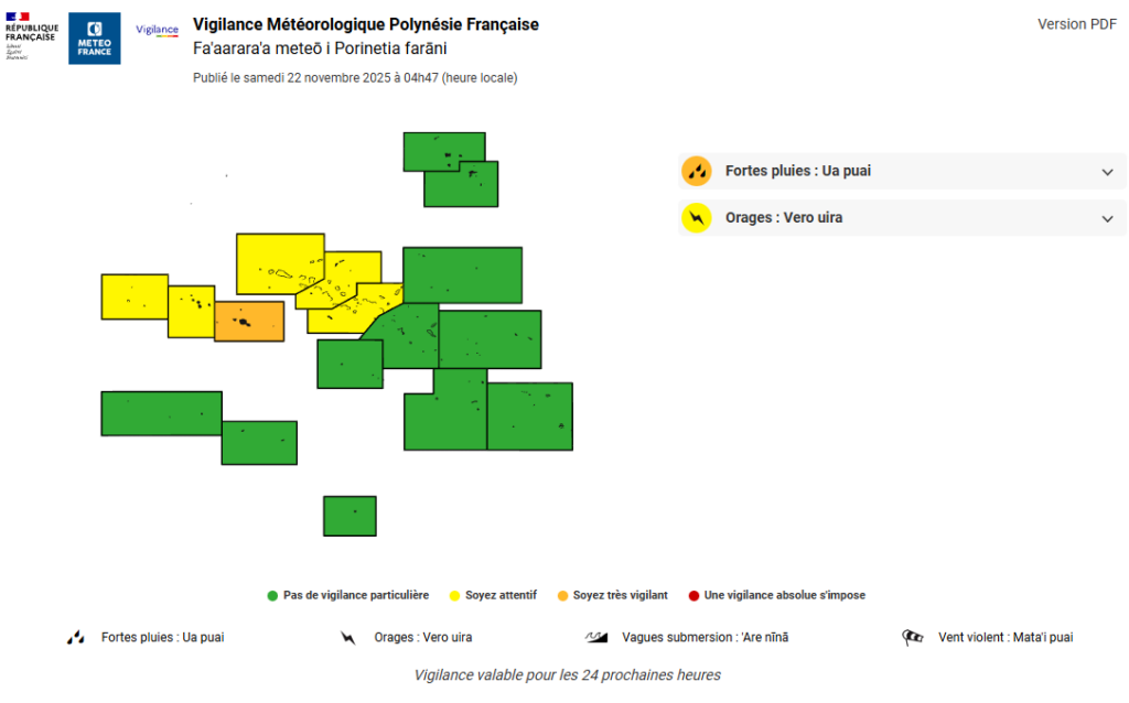 Abondance rime avec pluie et le déluge est bien au rendez-vous ce week-end. Météo France maintient la vigilance orange aux iles du Vent. Les Raromatai et une partie des Tuamotu sont en jaune pour les orages.