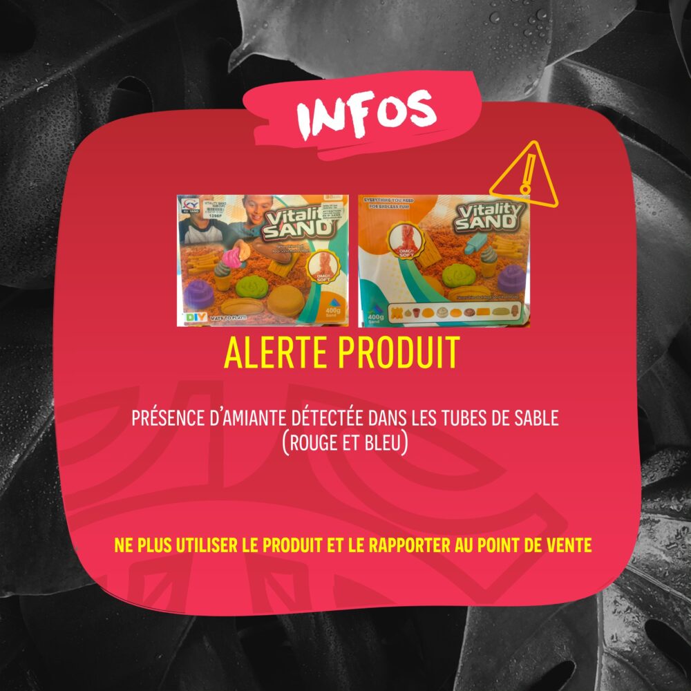 Selon les contrôles effectués par les services de la DGAE, de l’amiante a été détectée dans certains tubes de sable, notamment de couleur rouge et bleue. Ces fibres, lorsqu’elles sont inhalées, peuvent provoquer de graves problèmes de santé.