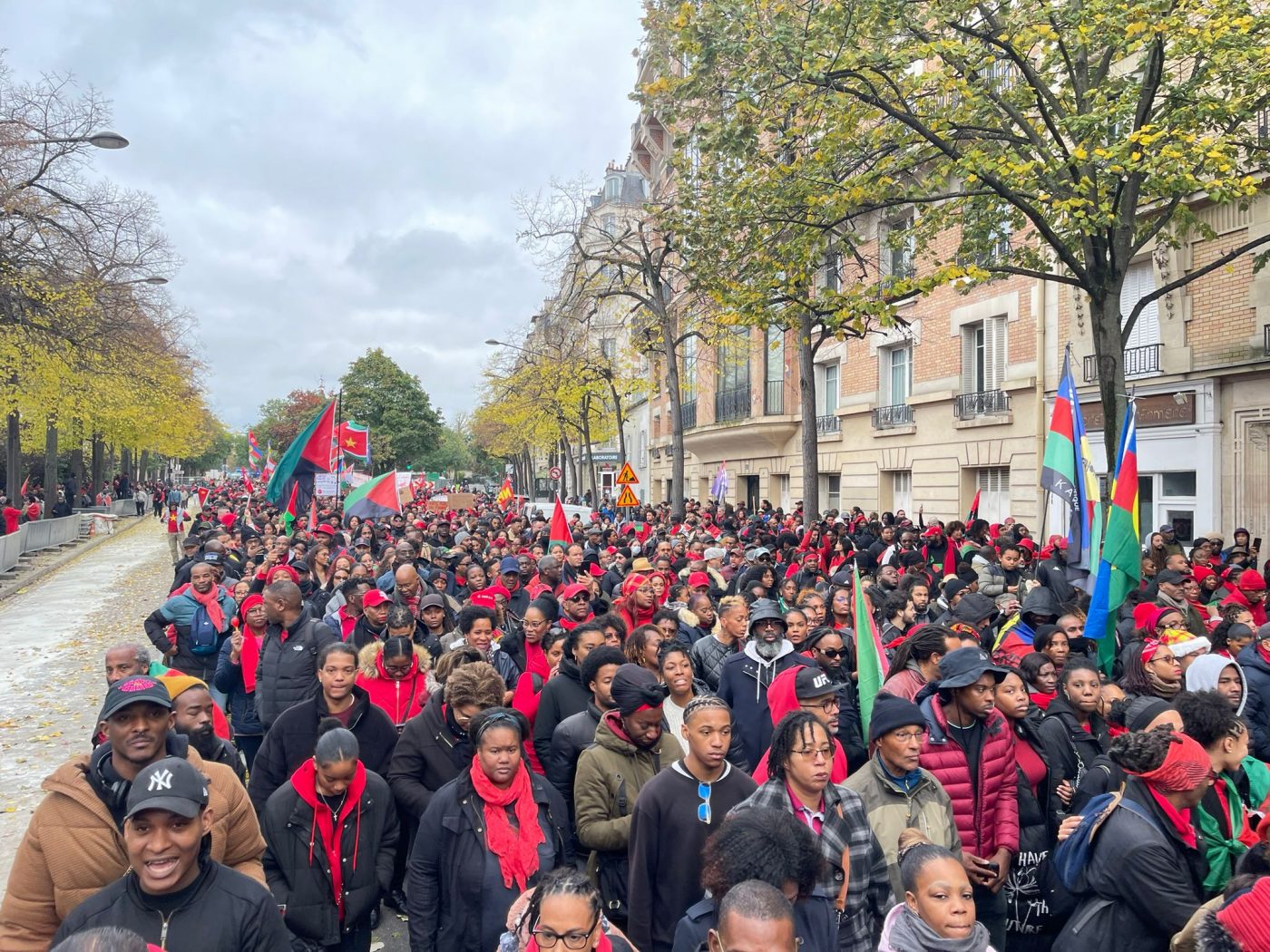 Formant un long cortège marqué de la couleur rouge, symbole de la mobilisation contre la vie chère en Outre-mer, les manifestants, venus à l’appel d’associations antillaises et kanak et pour beaucoup issus de la diaspora ultramarine, sont partis de la place Denfert-Rochereau pour rallier le ministère des Outre-mer.