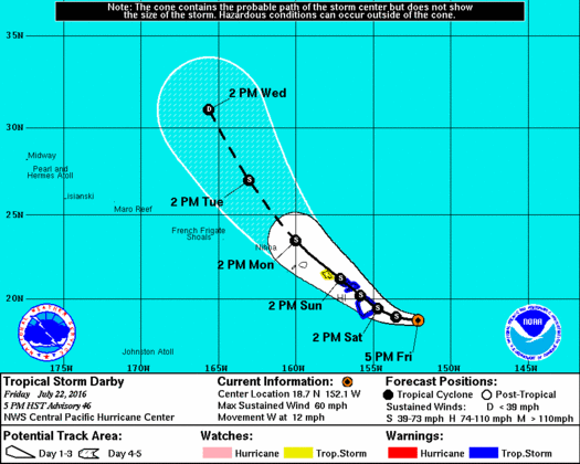 Vendredi soir, Darby était située à environ 725 km au sud-est d’Honolulu, la capitale de l’Etat de Hawaii. La tempête tropicale se déplaçait vers l’ouest à 19 km/h avec des vents atteignant 100 km/h, selon le Centre du Pacifique sur les ouragans (CPHC).