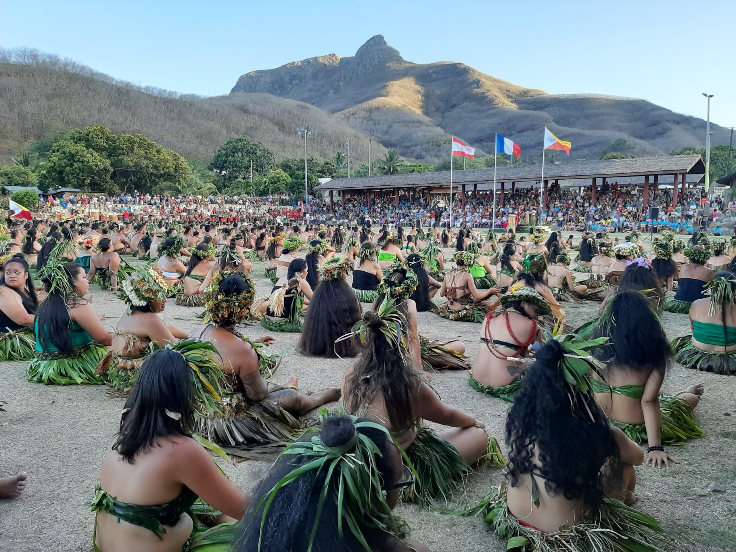 Après une pause salvatrice de quelques heures, a lieu le défilé aux couleurs des délégations. Tandis que l’ensemble des délégations est en costume végétal simple en ‘autī, on note la richesse du costume de Hiva Oa, avec pas moins de 15 éléments végétaux dont des morceaux d’ananas seché ! Au total ce n’est pas moins de 1 500 artistes réunis pour la très attendue mahaû katahi o te henua enana (danse du cochon) ! Puis vient la cérémonie du kava, les discours protocolaires avec en arrière-plan le crépuscule sur les pics mythiques de Ua Pou.