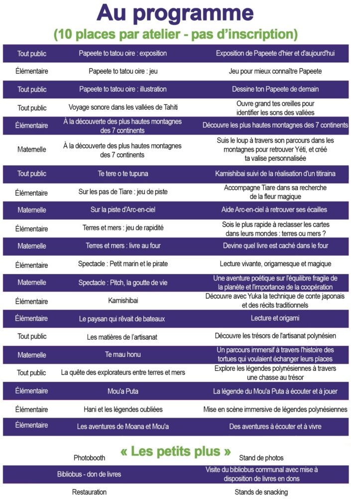 Au programme : jeux de piste, chasse au trésor, ateliers créatifs et sensoriels, lectures animées, mais aussi spectacles de théâtre pour tous les âges. L’artisanat local sera également mis à l’honneur. Une salle entièrement consacrée à Papeete proposera une exposition, un jeu sur carte et un atelier créatif, pour (re)découvrir la capitale autrement.