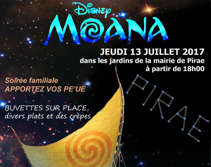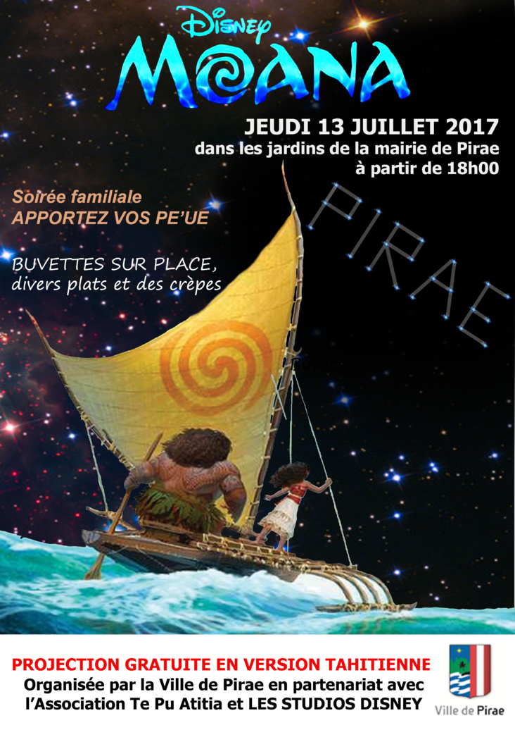 Pour permettre aux familles de Pirae de profiter d’un moment détente en famille en ce début des vacances, le maire de Pirae, Edouard Fritch, a pris l’initiative de mettre en place une projection sur grand écran du dernier trésor des studios Disney, Moana dans sa version inédite en tahitien.