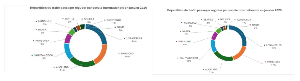 Si les liaisons vers Nouméa, Seattle et Narita affichent de légères progressions, les autres lignes (Honolulu, Paris-Orly, Rarotonga) restent stables. À noter toutefois un changement dans la desserte régionale : la ligne vers Nadi est suspendue depuis le 6 janvier.