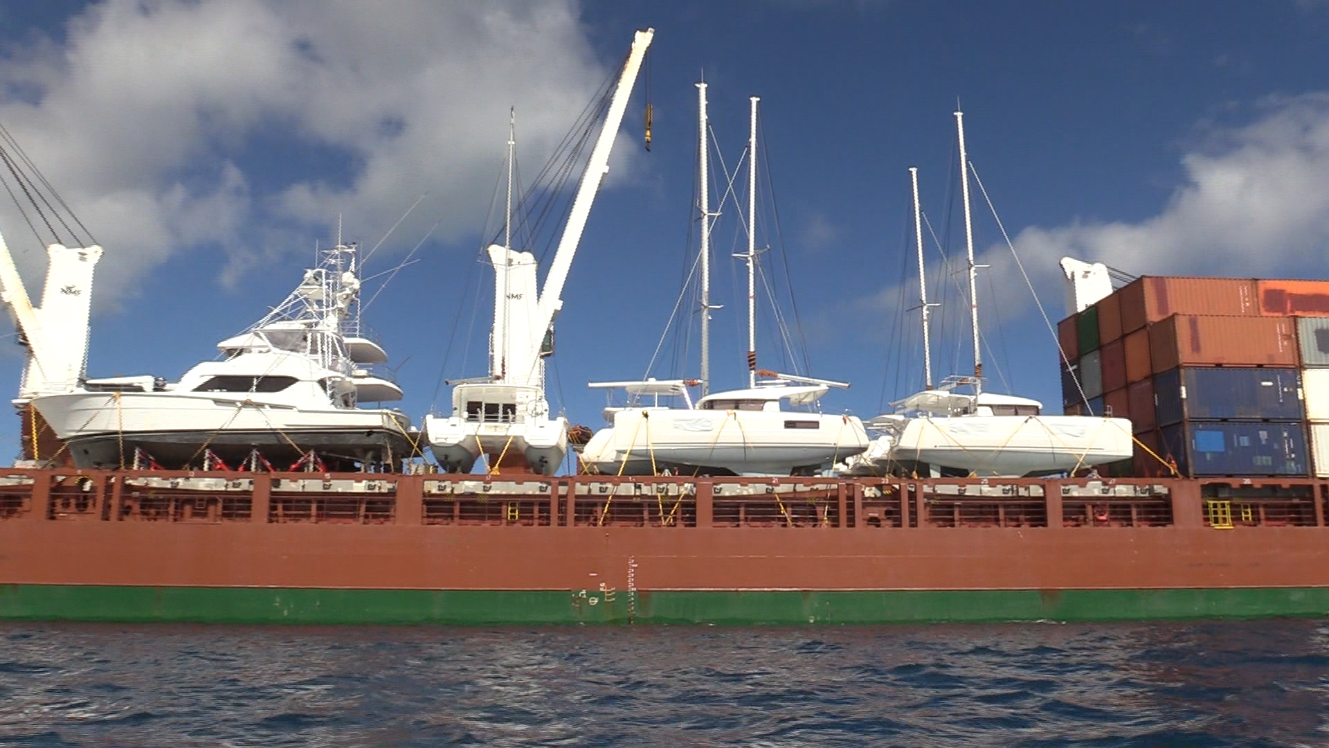 Le cargo est arrivé très tôt mercredi matin dans le lagon de Raiatea. A son bord, les 6 nouveaux catamarans Lagoon de 63, 46 et 40 pieds, achetés par la société Tahiti Yacht Charter. Le plus gros, Alegra, un catamaran à moteur sans voile, est le premier à toucher les eaux polynésiennes.