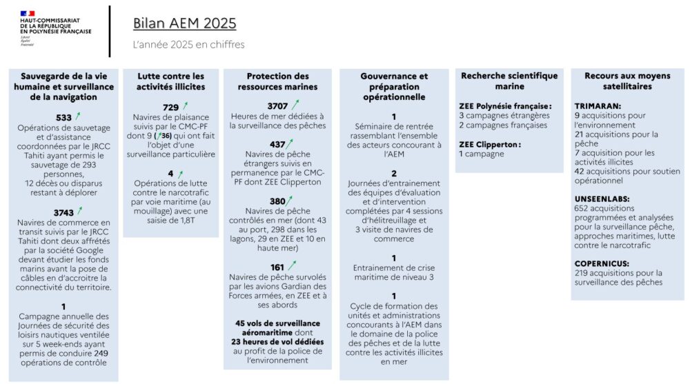 2025 marque également un tournant écologique avec la création de « Tainui Atea », faisant de l’intégralité de la ZEE polynésienne la plus grande aire marine protégée au monde. Côté ressources, le bilan confirme une nouvelle fois l’étanchéité de nos frontières maritimes : sur 380 navires contrôlés, aucun pêcheur étranger n’a été identifié en infraction de pêche illicite.