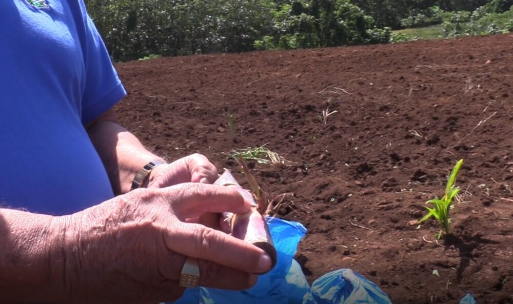 Sur le terrain, Vaitiare et ses collègues s’activent, rang après rang, sur une parcelle d’un hectare fraîchement préparée. Dans les mains des planteurs, 20 000 boutures de canne venues tout droit de Tahiti. L’implantation se fait à la main, rang après rang, avec un savoir-faire transmis sur le terrain. Vaitiare, l’une des jeunes participantes, explique : « Les cannes classiques, tu dois faire un espace de 50 cm et puis tu as aussi les cannes rouges, c’est-à-dire la noble. (…) On doit espacer au moins 25 cm.«