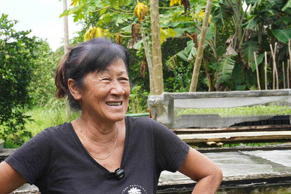 Elle qui s’était destinée à des études supérieure, fait finalement le choix de se consacrer à l’agriculture. À Taravao, elle et son mari plantent d’abord des arbres fruitiers. « Je me suis formée sur le tas. Je suis d’une nature assez curieuse, j’adore lire, me documenter et tout. On a démarré par de l’arboriculture, et puis au fur et à mesure, on s’est diversifiés aussi sur des choses moins pérennes, mais qui donnent plus rapidement. »