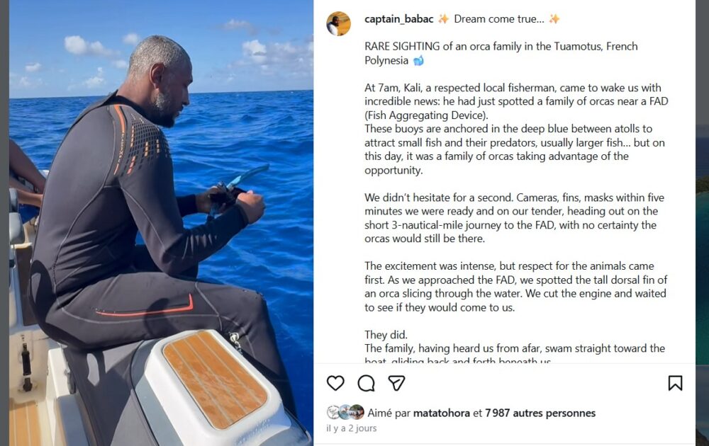 L’ancien joueur de NBA et de l’équipe de France de Basket, Boris Diaw, a croisé le chemin d’une famille d’orques, il y a quelques jours, dans l’archipel des Tuamotu. « Une observation de plus qui confirme la présence » de ces animaux « toute l’année en Polynésie », indique l’association Mata Tohora.
