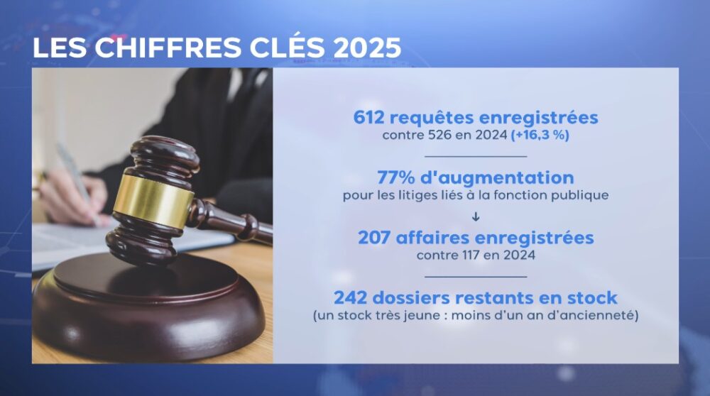 Dans le détail, 612 requêtes ont été enregistrées en 2025, contre 526 en 2024, soit une hausse de 16,3 %. Les contentieux de la fonction publique ont, eux, progressé de 77 %, avec 207 affaires recensées contre 117 l’année précédente. À ce jour, le tribunal compte encore 242 dossiers en stock, mais il s’agit d’un stock « très jeune », de moins d’un an.