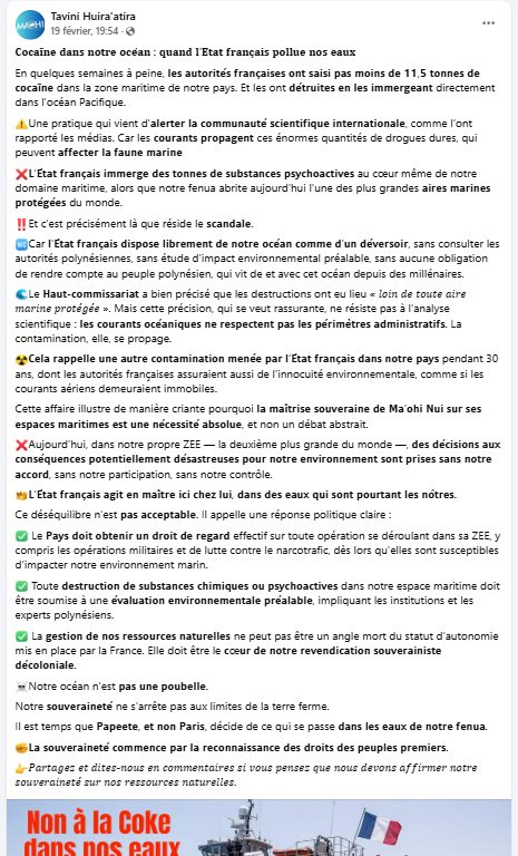 Jeudi soir, sur sa page Facebook, le parti indépendantiste Tavini Huiraatira a publié un texte dans lequel il accuse l’État de polluer les eaux du fenua. Depuis janvier, plus de 11 tonnes de cocaïne ont été saisies. La drogue a ensuite été détruite en mer. « Il n’y a pas de rejet de plastique, il y a juste les produits stupéfiants qui sont dilués par petites quantités sur des périodes très longues, de plusieurs heures, pour utiliser au maximum la dilution de l’océan. Et tout ça se produit très loin des côtes, à l’extérieur de la ZEE, à l’extérieur de l’aire marine protégée, pour éviter tout impact sur l’environnement », expliquait dans un reportage le contre-amiral Guillaume Pinget, commandant des forces armées en Polynésie française.