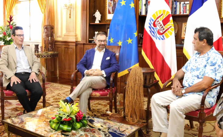 Le directeur général des services législatifs, Rémi Schenberg, et le chef de la division du secrétariat du comité d’évaluation et de contrôle des politiques publiques au sein de l’Assemblée nationale, Philippe Lamy, accompagnés de Jeanne Santini, secrétaire générale de l’Assemblée de la Polynésie française, ont rencontré, jeudi matin, le Président Edouard Fritch.