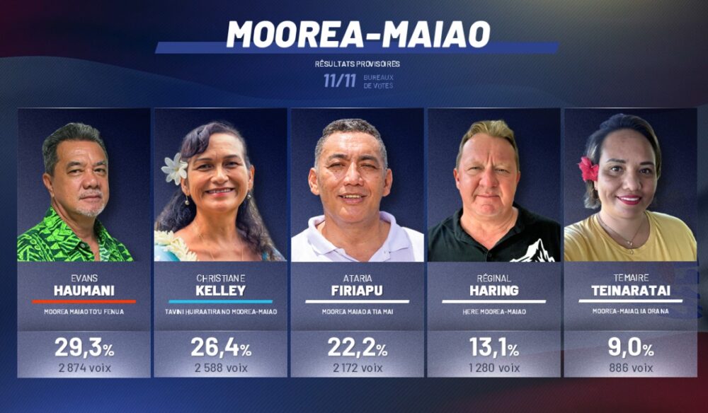 Ataria Firiapu, tête de liste Moorea Maiao A Tia Mai, termine troisième (22,2%), devant Réginal Haring (Here Moorea Maiao/ 13,1%) et Temaire Chavey (Moorea-Maiao, Ia Ora Na/ 9%).
