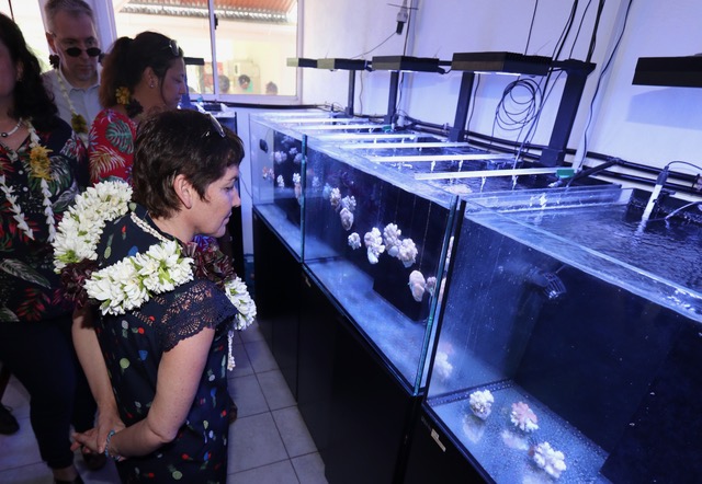 La ministre des Outre-mer a visité visité un laboratoire du centre qui entreprend des expérimentations sur l’évolution des coraux. « Je veux féliciter l’équipe du Criobe, le travail qui est fait ici, cette idée de dire qu’il faut vulgariser, en faire un produit plus ouvert à nos jeunes, aux touristes », a déclaré la ministre.