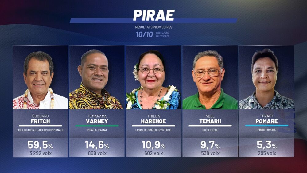 Dans une élection ouverte, avec cinq listes candidates, le maire sortant a largement devancé ses adversaires. Face à lui se présentaient Temarama Varney, à la tête de la liste « Pirae A Tia Mai » (14,6%) soutenue par le mouvement A Here ia Porinetia. « Nous sommes fiers d’avoir obtenu trois sièges » , a commenté la tête de liste.