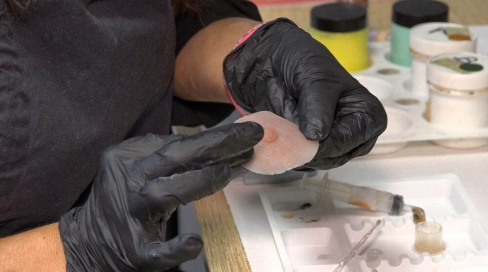La fabrication repose sur un moulage précis. Même les détails des grains de beauté sur la peau peuvent être reproduits grâce à différentes teintes de couleur. Après deux cancers, cette cliente a franchi le pas. Le mamelon en silicone, offre une vraisemblance qui redonne confiance. « J’ai eu un premier cancer avec ablation totale de glande mammaire et du mamelon. J’ai eu la chance d’avoir une reconstruction immédiate avec prothèse, mais par conte, il n’y avait plus de mamelon et ça, visuellement, c’est quand même difficile à regarder. (…) J’ai la chance d’avoir le mamelon qui a été conservé sur le deuxième cancer. Mais ce n’est pas parce qu’on en a gardé un qu’on est entière. C’est pour le moral, je l’ai fait pour moi. J’ai pu repasser devant un miroir sans chercher à me zapper. Je m’étais rendue compte que je me regardais plus. Avec la prothèse, je me sens normale et pas amputée.(…) Ça change tout de la perception qu’on a de soi-même. »