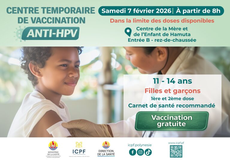 Un centre temporaire de vaccination contre le papillomavirus humain (HPV) ouvrira samedi 7 février au Centre de la Mère et de l’Enfant de Hamuta, à Pirae. L’opération est organisée par l’Institut du Cancer de Polynésie française (ICPF), sous l’égide du ministère de la Santé et en coordination avec la Direction de la santé.