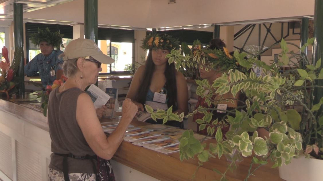 Depuis 2013, les élèves en formation ARCU du lycée professionnel d’Uturoa, en partenariat avec Tahiti Tourisme, participent à l’accueil des paquebots en escale à Raiatea. Mercredi, deux classes se répartissaient les tâches à la descente des 600 passagers du ASTOR. « Cela nous permet de nous former, à apprendre à mieux accueillir, à progresser, à apprendre de nouvelles choses au contact des touristes, à leur apprendre des choses etc. » explique Teapiki Teagai, élève en 1ère ARCU. « On est sur des postes clés du terrain qui n’ont pas été adaptés pour eux. Ce sont eux qui s’adaptent au monde du travail, avec ce qu’on leur demandera dans un an ou deux quand ils iront travailler. (…) Ils sont dans une autre dynamique et sont vraiment très investis » ajoute Gaëlle Prevost, professeure au lycée professionnel.