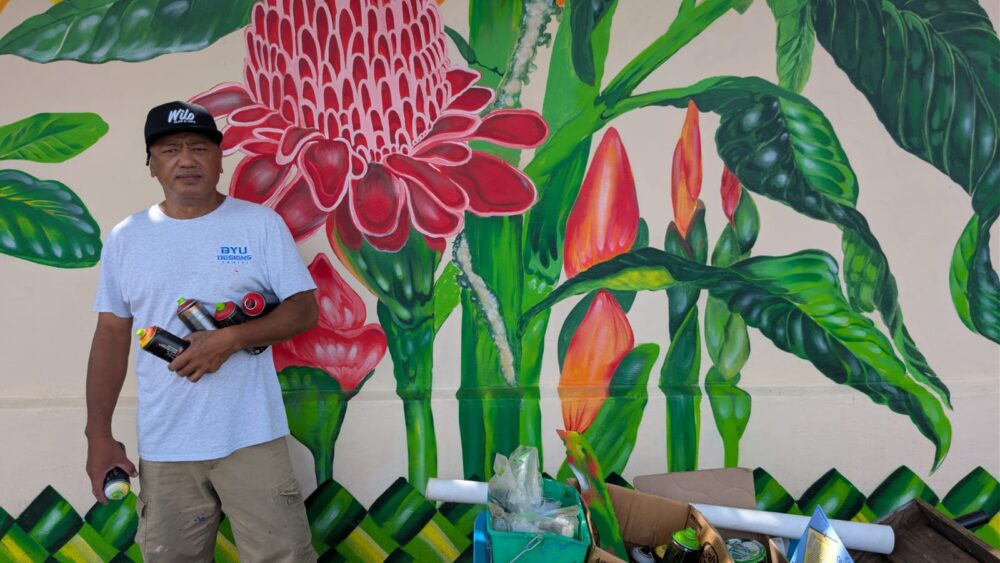 Des fleurs et des plantes colorées pour donner le sourire aux automobilistes et aux habitants. A Arue, aux portes du quartier Tearapae, Philippe Puahio exprime son talent à l’aide de bombes de peinture.