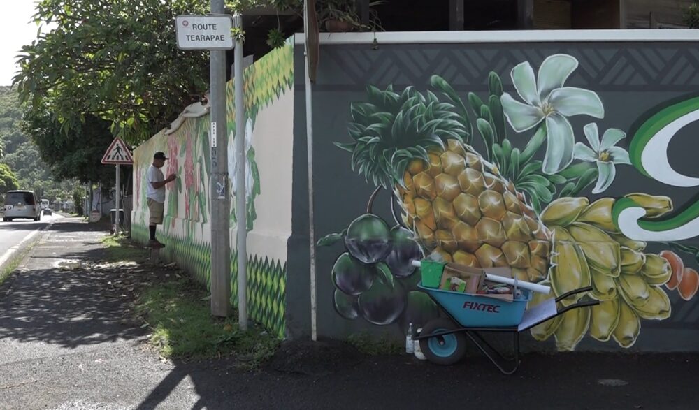 Enfant du quartier de Tearapae, où il vit toujours, Philippe s’inspire de la vie de son quartier pour ses fresques. Le mur de sa maison évoque la pêche. Un hommage aux générations passées.