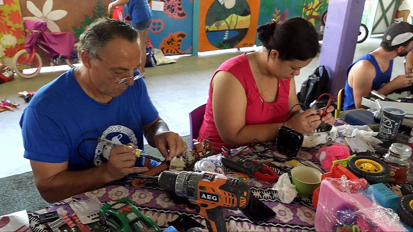 Des dizaines de bénévoles, de tous horizons et parfois résidant de l’autre coté de l’île, ont passé leur samedi dans cet atelier du Père Noël atypique. Stéphanie, autre bénévole, fait partie de l’équipe électronique : « En règle générale, c’est un fil qui s’est dénudé, ou des gens qui ont laissé des piles couler dans le circuit électronique. C’est un petit coup de papier verré, de produit contact et ça repart« , affirme-t-elle.
