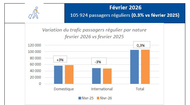 Depuis le début de l’année, le trafic passagers est en croissance. Sur la période de janvier et février, on note une croissance de 2% tirée par le domestique avec 228 767 passagers réguliers (dont 121 350 en domestique) sur la période soit 4% de plus qu’en 2025.