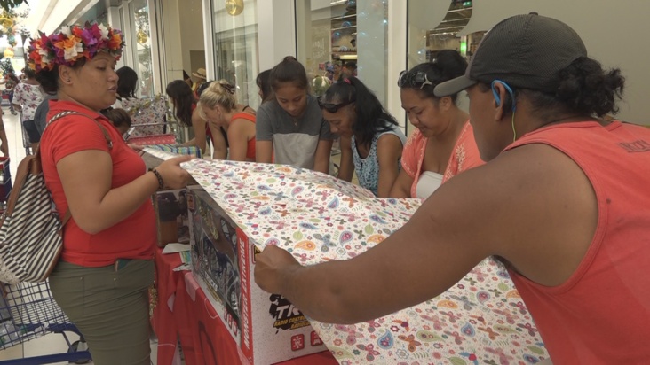 Depuis 4 ans lors des fêtes de fin d’année, l’association Tumuhiva propose aux clients d’un hypermarché de Pirae d’emballer leurs cadeaux. Chacun donne ce qu’il veut en échange de ce service. L’argent ainsi récolté servira à financer en partie leurs actions pour l’année prochaine.