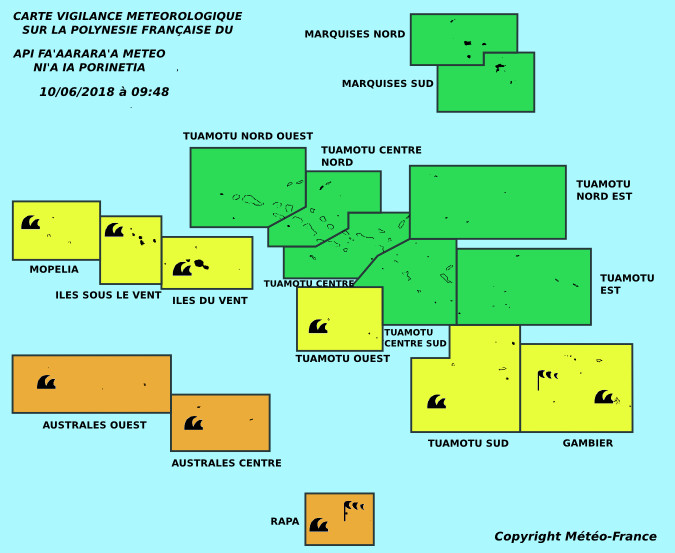 La vigilance jaune « vent violent » est maintenue pour l’île de Rapa. Les houles générées sont énergiques et continuent à s’amplifier dans la nuit de dimanche et la journée de lundi. Des mers fortes à très fortes sont attendues.