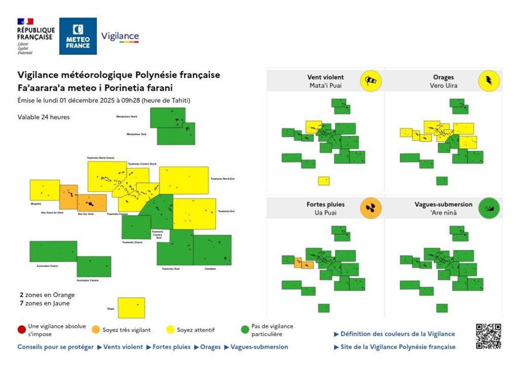 Tahiti, Moorea et les Raromatai repassent au orange. Météo France prévoit de fortes pluies dans les heures à venir.