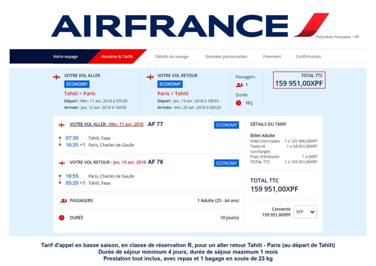 Des billets aller-retour à partir de 160 000 Fcfp, dès le mois d’avril. Ces tarifs sont ceux proposés en basse saison. Les prix planchers grimpent à 232 000 Fcfp en haute saison.