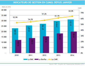 En novembre 2014, le nombre de chambres vendues par les hôtels classées de Polynésie française progresse légèrement (+0,4 %) par rapport à novembre 2013. Le retour de la clientèle française a compensé la contraction des autres marchés. La baisse de l’offre en chambres liée à la fermeture d’hôtels conjuguée à la quasi stabilité des ventes, permet au coefficient moyen de remplissage (CMR) de progresser de 2,9 points par rapport à novembre 2013 pour s’établir à 66,3 %. Sur la même période, le revenu moyen par chambre vendue (RMC) et le revenu moyen par chambre disponible (RevPar) augmentent respectivement de 3 % et 8 %. Depuis le début de l’année, le CMR s’établit à 64 % en progression de 2,9 points.
