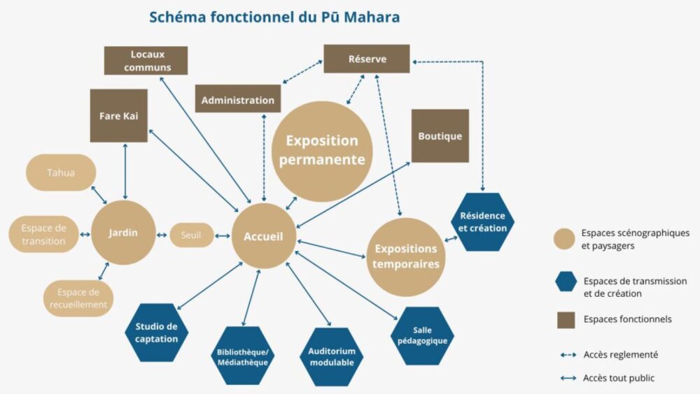Quant à l’espace muséographique, il sera une « atmosphère », une « expérience » et « un ancrage sensible en contemporain dans le monde ma’ohi ». Le jardin, lui, sera à la fois tahua et lieu de recueillement. Le Centre accueillera aussi un auditorium pour des spectacles, conférences ou débats, ainsi qu’un studio de captation et des résidences d’artistes.