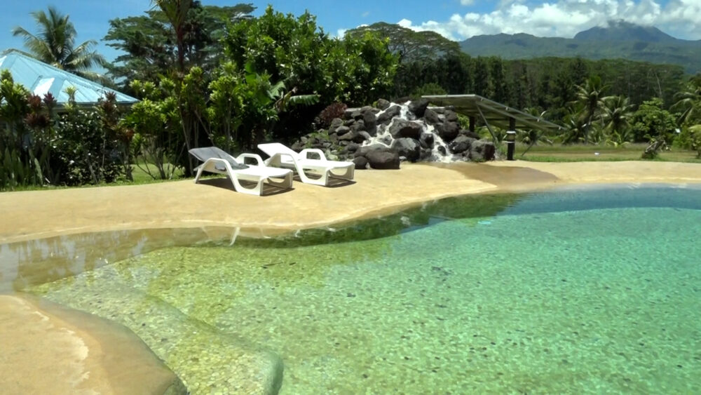 C’est sur un terrain de 5000 m² au-dessus de l’isthme de Tahiti qu’a choisi Cédric Morin et sa femme pour installer leur havre de paix. Ils font profiter étranger et locaux de leur magnifique propriété. Loin des réseaux électrique conventionnel du fenua, et de l’adduction d’eau de la commune, ils ont choisi d’installer leur propre source d’énergie électrique et leur adduction d’eau de pluie.