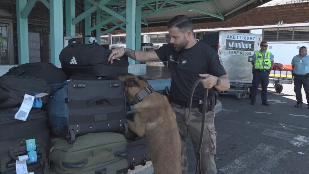 « On a contrôlé des départs vers Fakarava et on vient de voir un vol arrivé de Tubuai et puis les vols internationaux aussi, évidemment, explique le maréchal des logis Randy Grimardias, maître-chien. À la gare maritime aussi il y a eu des contrôles sur les ferries pour Moorea, mais aussi pour les départs pour les Raromatai puisqu’il y avait ce matin des départs. Et puis en ce moment, il y a aussi des contrôles aux Marquises, dans les îles Sous-le-Vent, au Tuamotu qui vont nous permettre de continuer à faire les contrôles à l’arrivée, à la fois avion, mais aussi bateau dans les Raromatai. Donc voilà, c’est vraiment une action de grande ampleur. »