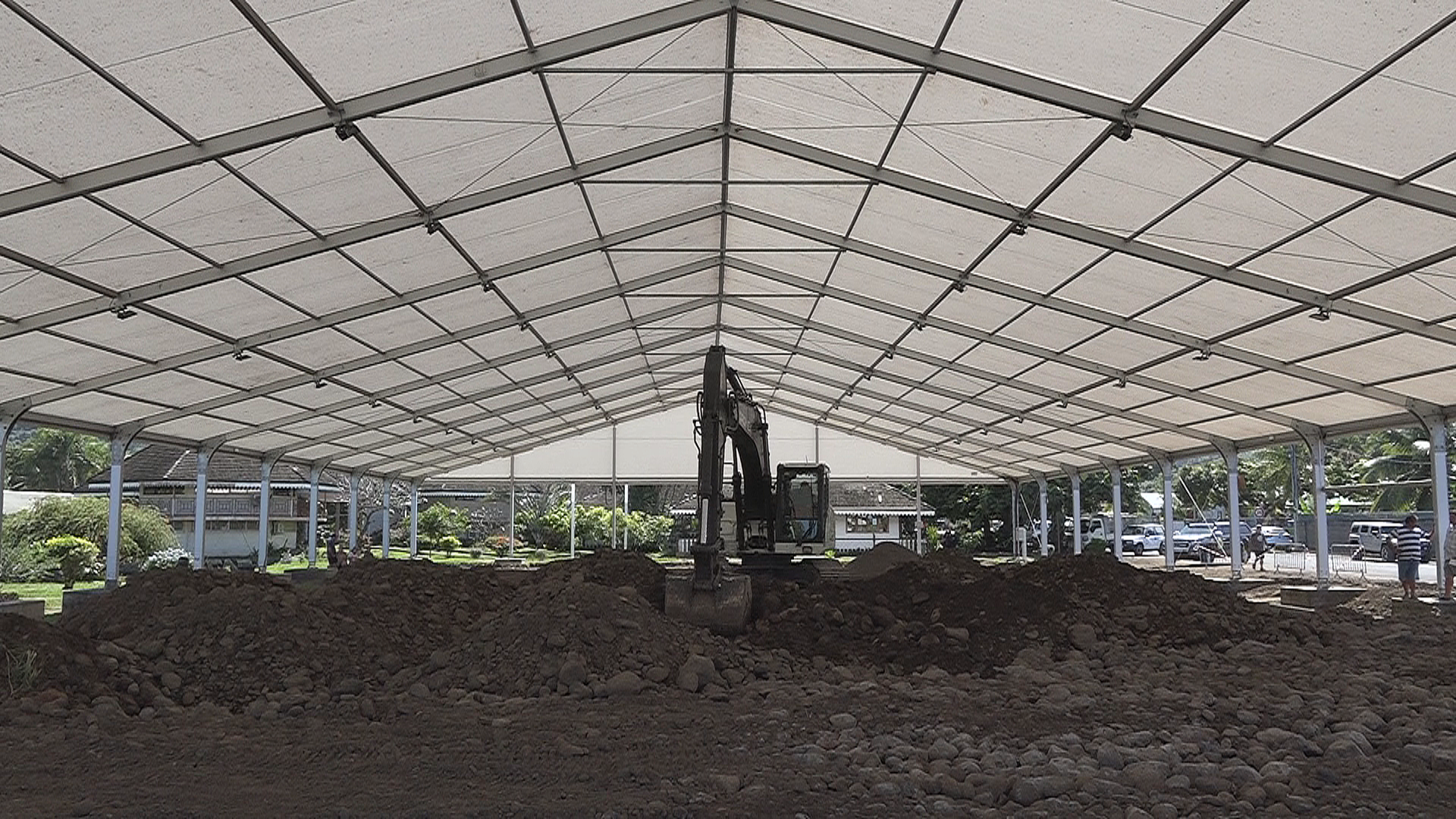 Pas moins de 3 000 m3 de terre sont étalés sous le chapiteau qui accueillera bientôt le marché de Papara. Après deux ans, les travaux reprennent enfin. Un soulagement pour la maire et son équipe municipale.