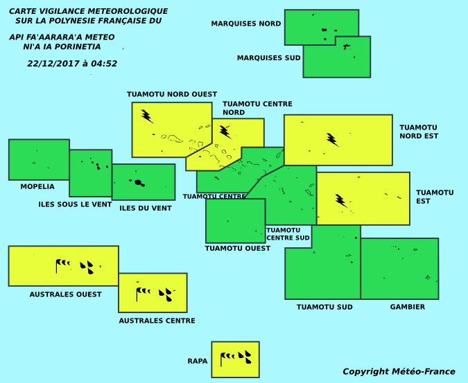 Une partie des Tuamotu et les Australes sont par ailleurs actuellement en vigilance jaune pour vent violent, orages et fortes pluies.