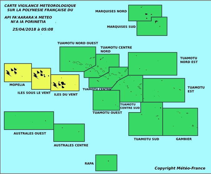 Au Nord, vent faible à modéré d’Est-Sud-Est mercredi virant Nord à Nord-Ouest assez fort jeudi avec des rafales à 70 kilomètres/heure. A Rapa, vent faible de secteur Sud mercredi virant au Nord-Est modéré jeudi.