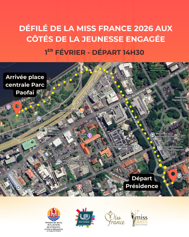Temps fort : Défilé de Miss France (départ Présidence → Parc Paofai) à partir de 14 h 30